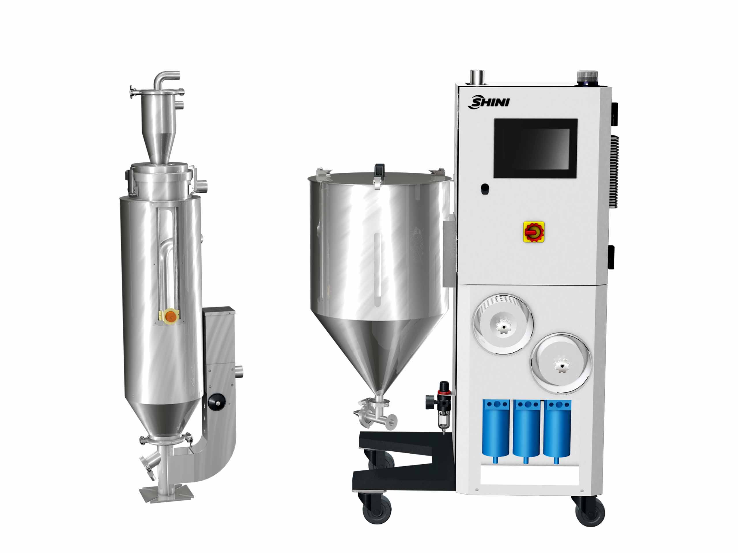 The nitrogen dryer SND-10 integrates nitrogen dehumidifying, drying, and conveying into one unit, consisting of the dehumidifier, storage hopper, and drying hopper. The unit is mainly used for drying optical-grade material for plastic injection, and filling nitrogen can prevent the injection molding materials from yellowing during the drying process. Besides, the nitrogen dew point after being filtered by the nitrogen membrane is very low.