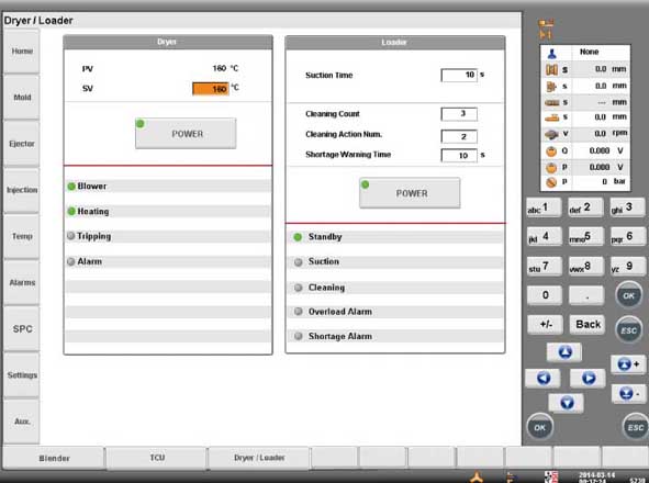 The system possesses control function of both injection molding machine and auxiliary equipment. Integrate the monitor functions of auxiliary equipment,like dehumidifying dryer,gravimetric blender, water chiller and mold temperature controller etc. into the control system of the injection molding machine, which realize to monitor the working state of the injection molding machine and each auxiliary equipment via the touch screen on the injection molding machine. Therefore, it can improve operation efficiency and device maintenance.