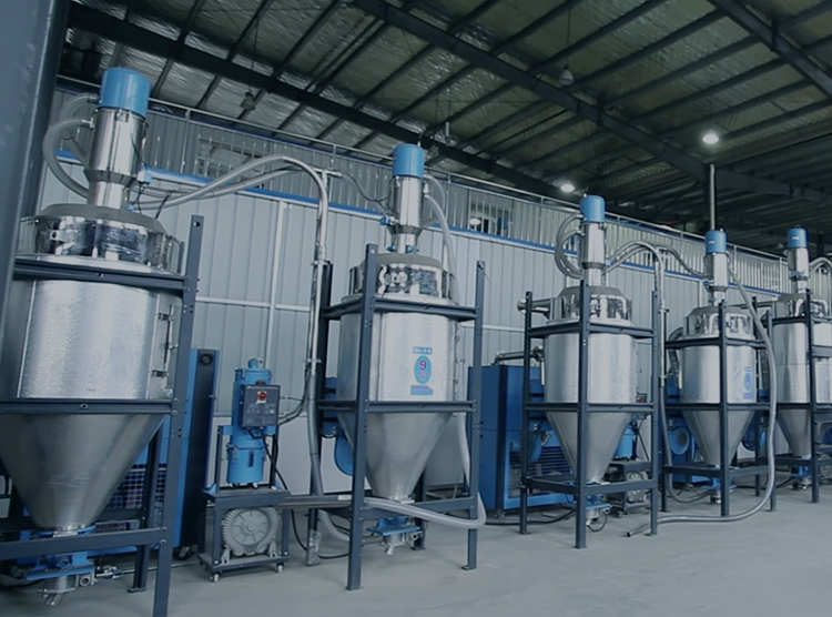 Closed loop of two-stage conveying system. For the conveying of materials to the hopper on injection molding machine, Shini can greatly reduce the heat dissipation and the risk of material rewetting.