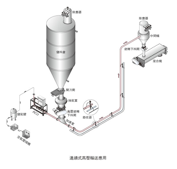 ACU空氣控制單元(Air Control Unit) 具高效率、低能耗、適用大流量範圍之優點,加上現代化科技發展,在氣力輸送中扮演著重要角色;連續式高濃度低速度粉粒輸送有效降低了物料在輸送過程中破碎機率,輸送壓力即時傳訊,控制閥開度可自動控制,大大節省空氣使用量。