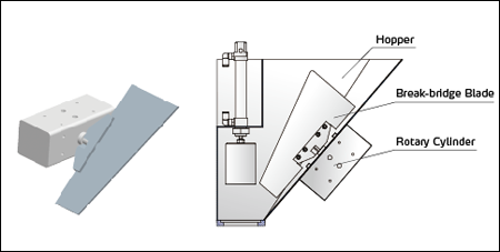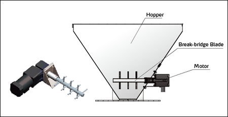Motor mixing or rotary cylinder anti-bridge device utilizes gear motor or rotary cylinder to drive the anti-bridge blade to make external force to the flakes. It pushes the flakes to discharge port direction, and makes break-bridge smoothly. With external force, it could ensure the flakes will fall into the weighing pan. But the material flow is unstable which brings about large metering fluctuation and costs a lot.