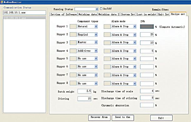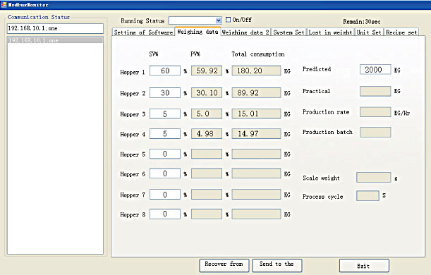 •The actual additive proportion, throughput, each material accumulated dosage and material flow rate, recycling material, master batch, additives can be read as below: