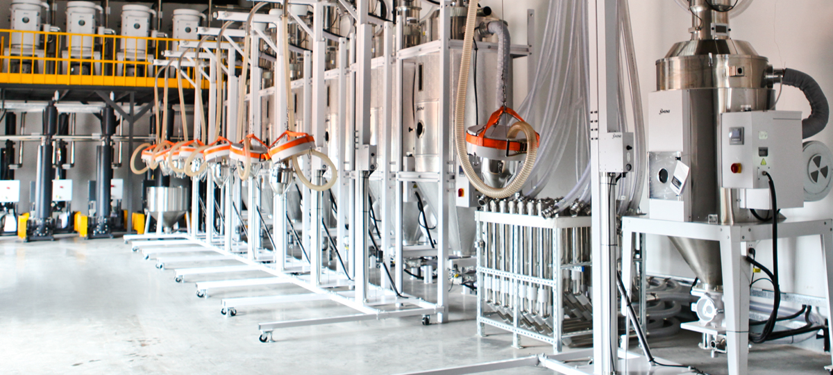 The central conveying system can minimize material contamination in the injection moulding production to maintain a clean production workshop. Moreover, the unique centralized dust recovery system makes cleaning more convenient, improves the environmental protection effect of dust-free workshop standards, reduces the noise, and finally realizes an unmanned automatic workshop for modern chemical plant management.