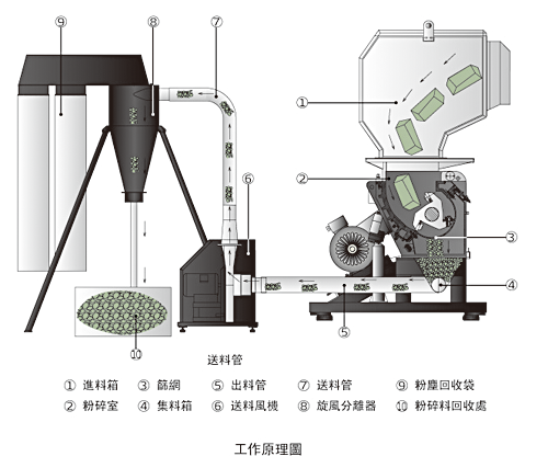 把要粉碎的物料通過進料箱投入粉碎室內,電機帶動刀架軸轉動,物料經過轉動的動刀片與固定刀片剪切將物料粉碎,顆粒大小由篩網孔的大小來決定,篩網位於粉碎室的下面,粉碎料通過篩網落入集料箱後,從出料管進入送料風機,風機經過送料管把粉碎料送至旋風分離器進行粉塵分離處理,粉末進入粉塵回收袋,粉碎料進入粉碎料回收處。