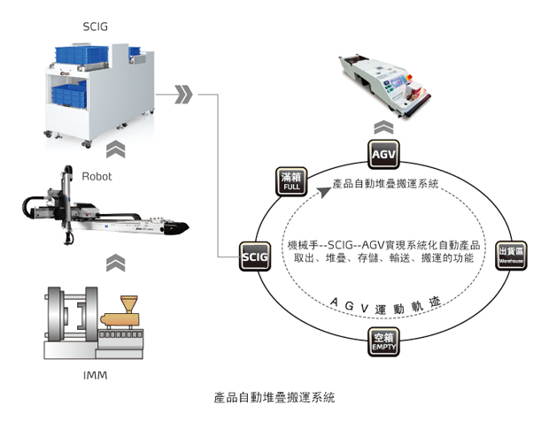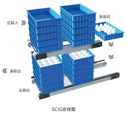 SCIG主要為產品的後期處理服務,可以單獨使用或搭配AGV實現智能化物流。與機械手信號連接,搭配適用實現產品自動裝盒作業。整機採用雙層式設計,充分利用了三維空間將產品放置到物料盒進行堆垛收集。搭配AGV無人搬運車,實現高效、經濟、靈活的無人化智能物流。