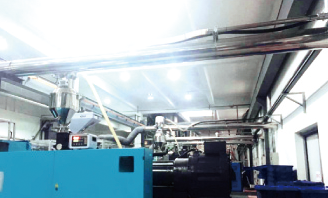 此次我們為該客戶規劃了整套集中供風系統,共27臺注塑機,每台搭配真空泵,2用1備集中供風,用特製手推車機邊上料。此系統與單機上料相比節約了注塑機周邊空間,減少了填料機維修率及更換配件費用,同時讓車間更整潔、降低噪音。