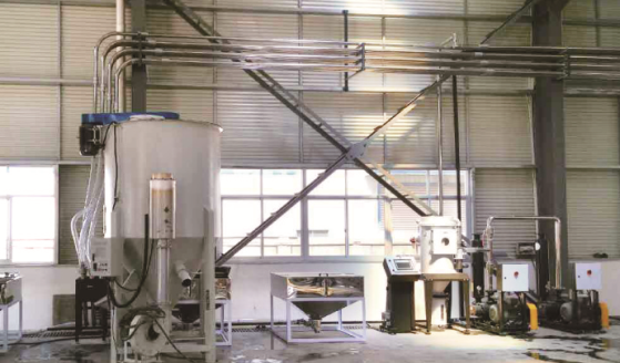 江西某管業有限公司是電力保護管,給水管,通訊管,MPP管,PE管,PVC管,MPP塑鋼管等產品專業生產加工的公司,擁有完整科學的品質管理體系。本期系統共規劃3條擠出線9個真空料斗和一台800T注塑機的中央供料系統;客戶常用PP,PE等顆粒原料,車間原料總用量達到20噸/天。客戶機台已有3台100公斤,7台200公斤信易牌料斗乾燥機對原料進行普通乾燥,乾燥機頂部安裝SMH-24L真空料斗;真空分離閥安裝於主風管上,通過一個橡膠膜片對吸風管氣流的接通與關閉進行控制,從而達到控制送風的目的。