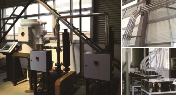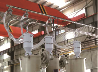 在供料房規劃3台400公斤不銹鋼儲料桶MST-400,底部各安裝一個氣動截料式吸料盒SBU-160-63S-V,1台中央原料分配站SMDS-3-7-2.5”;考慮到最遠機台距離供料房有100米且輸送量大,配備了2台魯式風機SRB-100-V提供風量,此機具有風量穩定、壓力變化小和能源損耗低等特點;輪換式工作模式,更能保護電機,避免因馬達損壞導致停機;搭配一台經濟型中央過濾器SCSF-200-F-E,採用每單次吸料後進行空氣過濾逆向清洗,避免過濾清器阻塞造成困擾;配備儲壓罐,安裝超壓保護,收集細微粉塵,保護高壓風機。