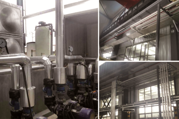 整體方案包含塑膠原料處理、水系統、電氣迴路及壓縮空氣系統,根據客戶工廠佈局,管路共分為三層佈局,頂層為電纜橋架和壓縮空氣管道,下層為原料輸送管路,由於客戶注塑機需冷卻水及冷凍水,故中間層為水系統,放置冷卻水管及冷凍水管,根據安全施工規範,層間設計0.5米安全距離,所有管道按照標準設計規範安全有序分層,兼顧美觀的需求。冷凍水管配備高品質保溫層,通過保溫層對熱量的傳遞實現有效阻斷,保證冷凍水溫度均勻,冷量散失少,且避免管壁結露。分配到各機台的水、氣管均安裝有壓力及溫度顯示儀錶,直接真實的顯示系統水壓、氣壓及溫度等狀態量。