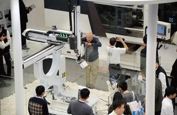 另外信易與成型主機生產商米拉克龍進行配套展示,米拉克龍提供了一臺全電動成型機供信易使用。在與成型主機生產商的聯合攻關下,對標準成型主機控制程式及介面進行了整合,加入了輔助設備的監控功能,方便使用者在單獨的成型主機的控制面板處可以對所有配備的輔助設備進行集中控制,此展示方式得到良好的展示效果。
