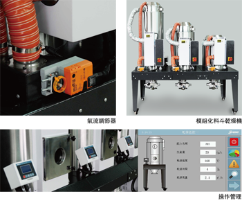SSMD採用西門子PLC+HMI控制系統,其人性化的介面讓操作變得更加簡單。主機觸控屏可以集中監控除濕主機和每個乾燥桶的運行狀態和參數資訊,各個乾燥桶上的溫控器也可進行獨立的溫度顯示和設定。該控制系統最大的特點是使用了風量自動分配控制技術。根據各個乾燥桶的原料類型和處理量的不同控制系統能自動計算出其所需的最優風量,通過變頻器和安裝在各個乾燥桶管道系統上的電動風門調節閥及風量感測器能夠對各個乾燥桶中的氣流進行獨立的、精確的測量和調節。保證每個乾燥桶獲得最佳的工藝操作條件。