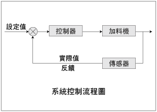 採用失重原理,通過PLC及變頻器控制餵料機螺桿的輸出量,使其滿足一定的螺桿填充比例以達到餵料的目的。由於採用了稱重計量,精確地反映出實時的餵料量,通過閉環控制(如圖:系統控制原理圖)達到精確餵料的目的。